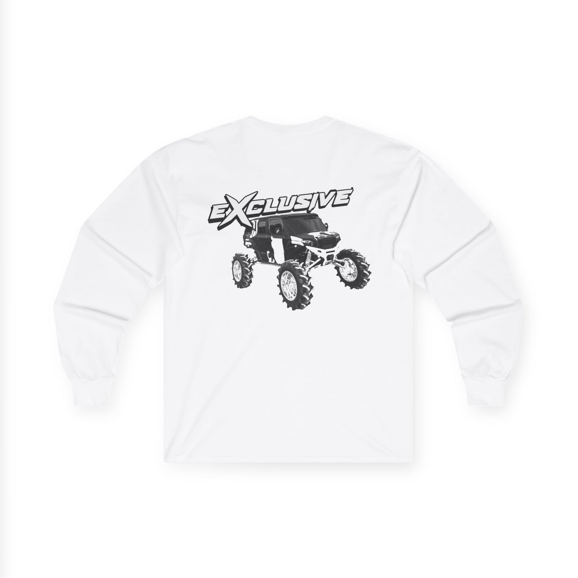 This long-sleeve tee carries a rugged, retro race-team vibe — soft yet substantial cotton with a vintage-weight hand and a bold off-road graphic on the back. The front chest shows a compact badge-style logo while the back features a sketch-like lifted truck and energetic “EXCLUSIVE” lettering. It wears like a lived-in favorite: sturdy ribbed cuffs and collar keep the silhouette neat, tubular knit construction feels smooth against the skin, and the medium-weight fabric gives structure without feeling heavy. Wear it on cooler mornings at the track, layered for weekend trail runs, or as part of a casual street-to-dirt outfit that signals you’re here for the ride.